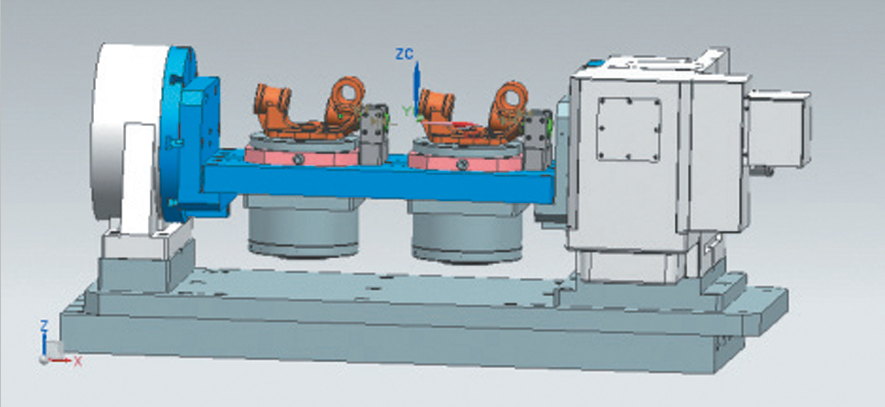 图2、图3所示为该夹具设计的实体三维图和实体剖视图,该夹具采用双工位设计,同时装夹两个工件,夹紧定位采用液压拉缸加锁紧弹套设计,有效避免了转角油缸压爪对刀具加工路线产生的干涉。使用中具体安装如图4所示,其中U形定位卡槽在制作装配时保证与定位心轴配合间隙为+0.05~+0.10mm、对称度≤0.01mm,使该处配合在加工过程中对工件起到支撑定位作用,为了防止出现过定位现象,前道工序在加工时,保证工件c 基准与a 基准的对称度≤0.04mm。锁紧弹套起弹性定位、夹紧元件的作用,材质为65Mn,热处理。