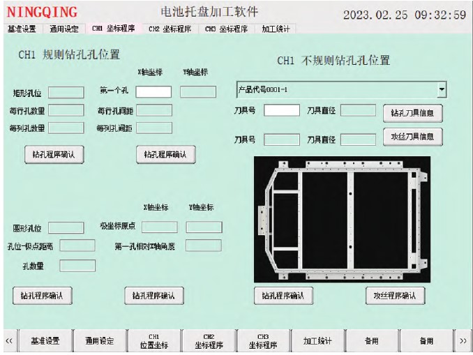 此机床采用定制化数控系统界面,仅需要输入孔的位置,即可调整规格品种的程序,钻孔攻螺纹的参数可以在后台程序调节。该系统可实现多通道控制,每个卧式通道负责加工产品的一部分。通过定制化软件,有效将工件分成3部分,每部分由1个卧式通道完成,大大提高了加工效率。