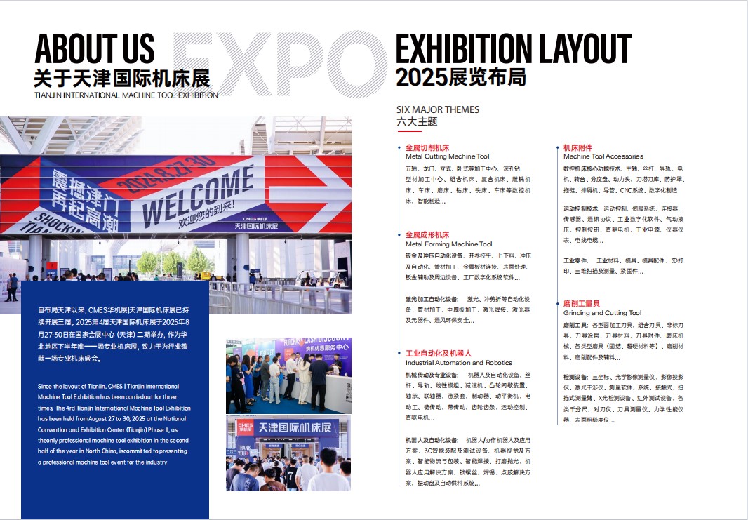 2025年天津国际机床展,以50000㎡展览规模,聚焦金属切削机床、金属成形机床、工业自动化及机器人、磨削工量具、机床附件、电加工六大产业集群,全方位展示机床上下游产业链的核心技术和前端产品,引领制造业同僚竞逐新赛道。