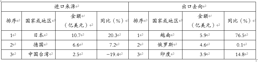 根据中国海关数据,机床工具商品进口来源和出口去向排名前三的情况,详见表5。