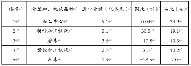 表8 2025年上半年进口金额排前五位的金属加工机床品种