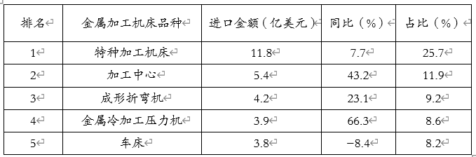 2025年上半年,进口前五位的金属加工机床品种及其进口金额,详见表8。