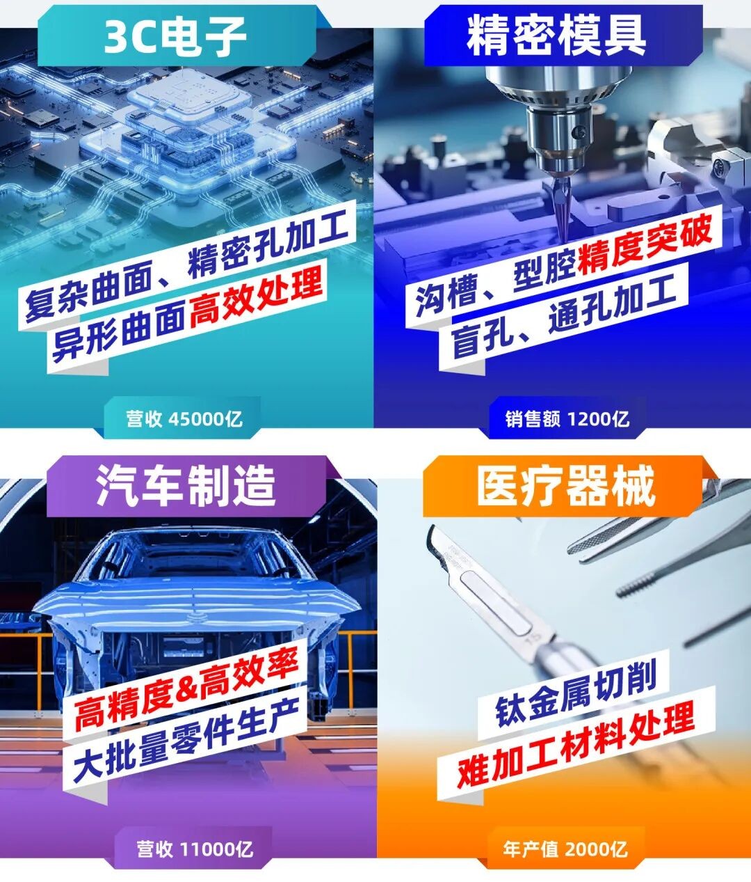 4大应用聚焦,震撼华南!展会聚焦行业精密零件加工,重点锚定3C电子、精密模具、汽车零部件、医疗器械等行业零件加工场景,致力于助力机加工朋友突破高精、高效等加工困局。