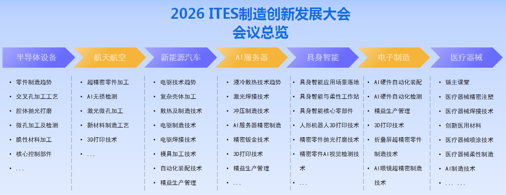 作为2026 ITES“展+会”生态的核心组成,同期系列会议聚焦更行业核心零部件及先进工艺应用,精准覆盖半导体设备、新能源汽车、AI 服务器、具身智能、电子制造、医疗器械、航空航天7大热点赛道,打造80余场高质量主题论坛。