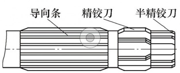 (1)加工中心机床加工。①采用粗铰刀分别对进气凸轮轴孔和排气凸轮轴孔的第1档凸轮轴孔(作为刀具工艺导向孔)做粗铰加工,完成后,退出工件,粗铰刀直接返回刀库。②进入下一工步,采用粗、精铰复合刀完成凸轮轴孔的精铰孔工序。刀具呈前小后大的阶梯形,包括粗铰刀、精铰刀和导向条等(见图1)。首先粗铰刀进入第1档粗铰凸轮轴孔(此时不切削)实现刀具导向,随着刀具慢速工进,粗铰刀粗铰第2档凸轮轴孔,同时精铰刀,精铰第1档(已粗铰)的凸轮轴孔尺寸至φ (23+0.023)mm。重复以上加工直到最后一档凸轮轴孔完成精铰加工尺寸φ(23+0.023)mm。粗、精铰复合刀具退出排气凸轮轴孔,重复以上加工过程, 完成进气凸轮轴孔的精铰加工尺寸φ (23+0.023)mm。