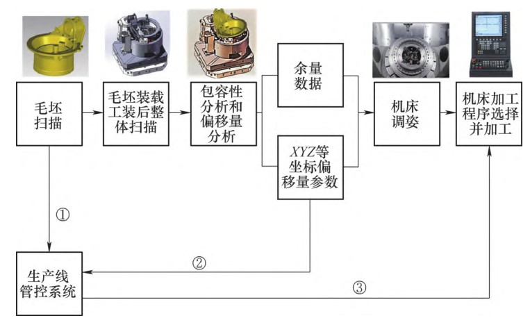 国内航空发动机制造企业基于“工况自感知-软件自决策-机电液自执行”的闭环控制理念,成功实现了具有自主知识产权的壳体工艺装备智能化组线。该组线创新性地开发了无附加变形的可转位升降式液压夹紧与对中定位装置,集成了自动物流传输系统、智能托板库等智能化单元。同时,通过海量扫描点云的快速配准技术,建立了毛坯测量点集与零件理论模型的空间映射关系,实现了数据驱动的毛坯包容性判定、加工余量均匀优化及定位参数自主辨识。此外,基于自主研发的数控系统与专用刀具,创新性地提出了钻削、高效插削以及光整侧铣的复合加工工艺,显著提升了壳体的制造效率与表面精度,为航空发动机核心零部件制造能力的提升提供了关键技术支撑。壳体类零件毛坯包容性分析与自适应定位如图3所示。