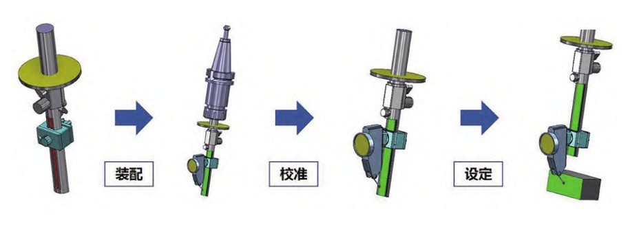 装置由表杆轴机构、表夹滑块机构及角度刻度盘机构组成。表杆轴上端设计成圆柱形,和数控刀具一样可以装夹在机床刀柄上,下端设计成半圆柱形,半圆柱平面与自身圆柱轴线重合。表夹滑块机构起到对百分表的夹持和位置调节作用,它可以带动百分表在表杆轴机构上移动。角度刻度盘机构的作用是记录加工坐标系测量时,百分表的角度位置,保证在第二次设定坐标系时可以在相同的角度位置上测量。数控加工坐标系设定流程如图2所示。