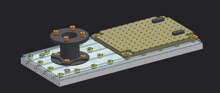铝连接板根据电动机壳固定区域的大小制作,在铝连接板的四个角位置加工通孔,并将定位套过盈压装进去。表面均布沉头螺纹孔,铝连接板下表面为沉头孔,可以实现电动机壳、支撑块倒把固定,或在上表面固定压板等功能。