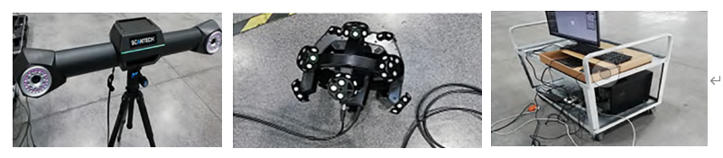 激光扫描设备由跟踪器、球形扫描头、数据处理设备组成,如图1所示,扫描前对设备进行预热和仪器精度校准,扫描后删除非连接项和孤立点,进行点云网格化,最后输出网格(STL)文件,并导入理论数据,进行拟合比对。