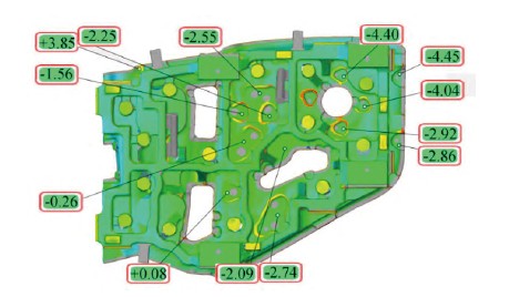 模具零件加工完成后,需采用三坐标测量仪对凸、凹模进行尺寸精度检测,因此需要尽量降低因测量误差对产品尺寸造成的影响,影响三坐标测量仪精度的因素除自身的制造和安装误差外,还有测量基准误差、机房温度误差、模具零件支撑装夹重力引起的变形误差等。如温度是影响测量仪精度的较大因素 ,按照标准测量室的标准温度是(20±2℃,变化梯度为24h内不得超过1℃,尤其在季节变化时,机房的温度与校验时存在较大误差,包括因光栅温度与量块温度不同而造成的误差等都需要进行补偿,误差补偿是一项以较低成本大幅度提高测量精度的先进技术。对于实际生产,从经济效益考虑,只需考虑对模具测量误差数值影响较大和容易解决的因素。因此,从模具零件毛坯的扫描精度、加工后模具测量室的温度控制以及装夹支撑方面进行了精度提升,能够提高模具的制造精度,降低开发成本。