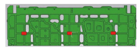 (1)左中右支撑下的自重变形。图6所示为左中右6点全部支撑下的模具垫块支撑设置,通过设置不同垫块支撑来计算模具自重引起的变形量。